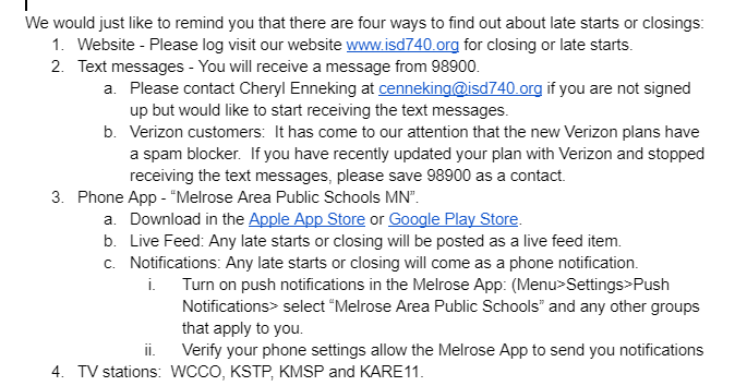 Please remember to not rely upon just one source of information. If the weather looks really bad but you did not get a notification through our school app, make sure to check the other sources of information. We have learned that at times, cellular service can be compromised by the weather.
