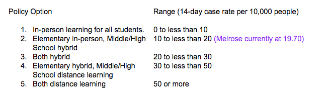 It is important to note that we could change very quickly depending upon a significant outbreak either in the county or in our district. Two weeks there was 1 school district that had a number higher than 50. This past week, there were 6 school districts with a number higher than 50. These 6 school districts along with 3 districts with a number between 30-50 would show a total of 9 school districts in the state of Minnesota that are distance learning at the middle school/high school. This represents slightly more than 10% of the school districts in Minnesota.