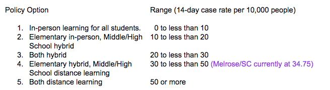 Once again, as predicted, our numbers have gone up significantly in Stearns County last week. The Stearns county number jumped to 34.75. This would be the 2nd of 3 weeks of data points that will determine whether or not we make the next jump to a different learning model. Another factor taken into account is the number of outbreaks we have in our school. Last week we also had some small outbreaks in our school that were isolated and quarantined. Because of this, we are planning to go to Policy Option 3 after MEA week. Starting on Tuesday, October 20 (no school on Monday October 19) we will go to the hybrid model in the elementary. As discussed in the past, switching to hybrid in elementary does not bring a significant change other than pulling a few students out of classrooms and moving some classrooms.
