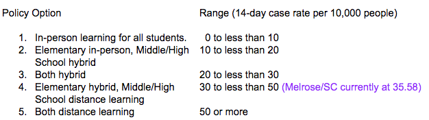 Although the number for this week was only a slight increase from last week there is the strong possibility we may go to distance learning very soon. Our number for this week was 35.58 as compared to 34.75 last week. The only issue that may cause us not to go to distance learning is the very low incident rate we have had in our buildings. It has been very low for the past couple of weeks. However, as we continue to see the numbers increase drastically in the county we may go to distance learning as early as next week.
