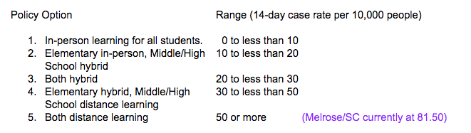 The information we are receiving from Stearns County is the virus is still in the phase of a “substantial community spread”. Our county number increased 15 points from last week and now stands at 81.50. Information we received from county officials last week is that there will be a consistent rise in this number through early January.