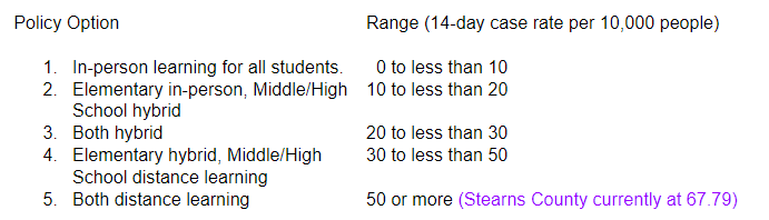 If you recall before the break, Governor Walz had stated that he wanted all elementary students back to school by January 18th. This does not impact our school because we have been very fortunate to have our elementary students in school this year.  With our middle school and high school coming back to the hybrid learning model on January 11, our next step would be to bring back all of our students every day. Certainly, this is something that most parents and students would want as quickly as possible. We will pursue the in-person model for all students as quickly and as safely as we possibly can.