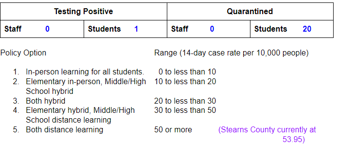 As reported last week, the Minnesota Department of Health is not focusing on the metrics they set forth in the fall that you see above. With our staff largely vaccinated and our in-district numbers remaining low we do not anticipate changing our learning model. We are also optimistic with the projection for next week showing a very small increase that we have hit a plateau in this latest surge.
