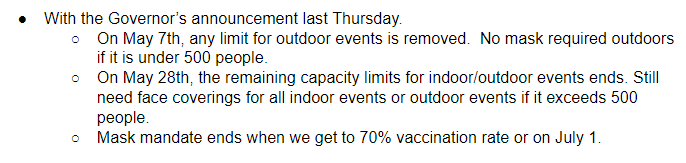 Our Vaccine Clinic went very well last week. We had 23 students/adults receive their first vaccination. This is important because of the Governor’s Announcement last week.