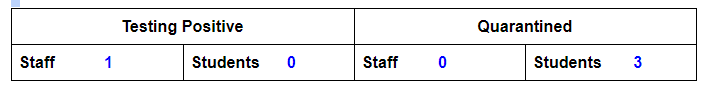 We continue to see the numbers going down at a modest pace. Although we have a cool and hopefully rainy week coming up there will still be opportunities for students to get outside and take their masks off.