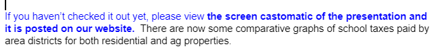 I want to continue to caution you on the tax calculator located on our website. Attempting to use this for ag land will not give you accurate information. It states on the website to reach out to Ehlers directly with your questions on calculating the tax impact of ag land. Calculation of the tax impact on ag land is very complicated. There are numerous factors that go into this calculation. Here are the direct contacts for Ehlers: