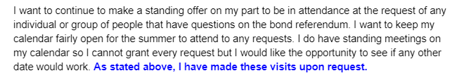 At our facility open houses we had a few people that came in for a tour of the buildings and grounds. They had either been to the community meetings or viewed the castomatic presentation on our website. They wanted to see many of the items that were discussed in both the CTE areas and activities areas. The requested areas to see were the lack of restrooms in the DCD areas. Updates needed to the current metal and wood shops were also viewed. The auto tech area in the garage was more of a needed area than most people on the tour were aware of from the presentations. Many people were aware of the needed updates to the pool area. They have been to swim meets and were aware of the age of the pool and the lack of capacity n the spectator area. Many people on the tour were surprised at the size of the cracks on the tennis courts. These tours allow people to get a firsthand look at the needed updates to our facilities.