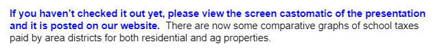 I want to continue to caution you on the tax calculator located on our website. Attempting to use this for ag land will not give you accurate information. It states on the website to reach out to Ehlers directly with your questions on calculating the tax impact of ag land. Calculation of the tax impact on ag land is very complicated. There are numerous factors that go into this calculation. Here are the direct contacts for Ehlers: