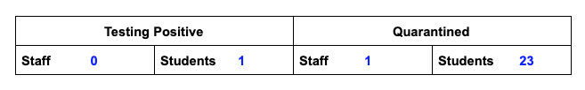 Once again as you look at our numbers within our buildings this week, we continue to stay at a very low level. You can see these numbers in the chart below.  We need to continue doing everything we possibly can to keep these numbers low to keep our students in school and create a safe environment for our staff and students.
