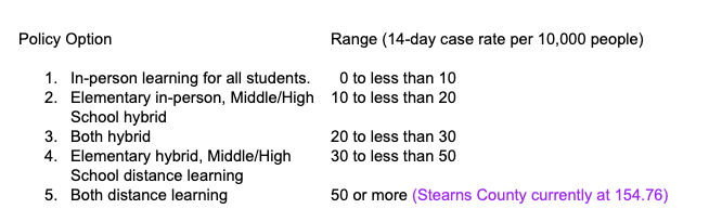 The current number and the daily numbers in Stearns County have overall been trending downward since the peak in late November. The number this week is 154.76.  I started out the Incident Command team with “although the numbers continue to trend downward, we are not out of the woods yet....”  Even with the Governor’s order that will allow us to bring students back into our buildings, we need to remain vigilant on all levels of mitigation.