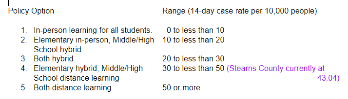I reported last week our small allotment of 5 vaccines for Melrose Area Public Schools. There is hope this week the allotment will increase. If this occurs the number of teachers and other staff members will also increase. This will also create a safer environment for our staff and students as we allow more students into the classroom on a daily basis.