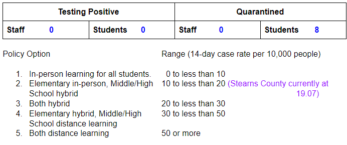 Nothing at this time changes in regard to all of the mitigation measures we have in place. We need to continue to wear masks in schools and at all events and activities in our district. We have turned the corner on our ability to get all students in school on a daily basis and have all activities in place. Please continue to partner with the school to keep on our current plan to serve all of our students.