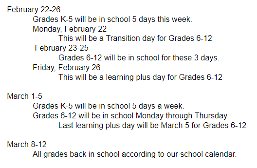 We continue the roll-in process this week to bring our students back to school on a full-time basis: